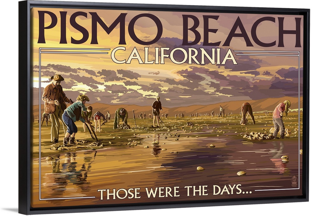 <p>Retro stylized art poster of a coastal scene, with people digging for clams.</p>