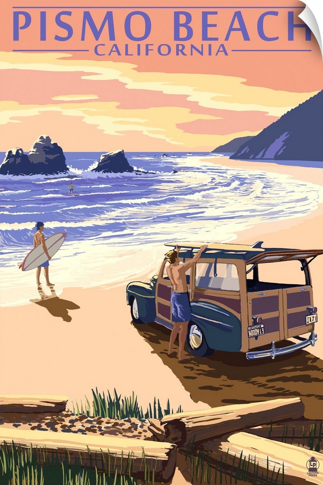 <p>Retro stylized art poster of two people and a vintage car on a beach sunset with surfboards.</p>