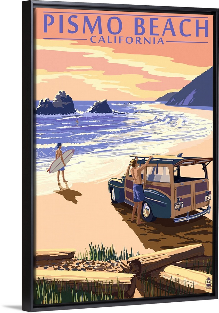 <p>Retro stylized art poster of two people and a vintage car on a beach sunset with surfboards.</p>