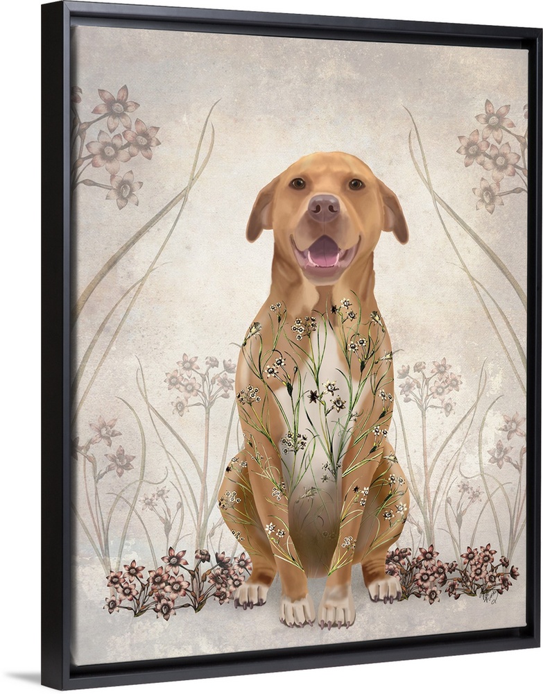 <p>A light brown pitbull surrounded by curling flowers.</p>