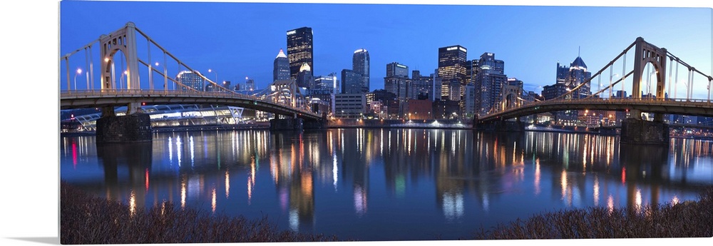 <p>Panoramic view of the Pittsburgh city skyline in the evening reflected in the water, with two of the Three Sisters bridges on either side.</p>
