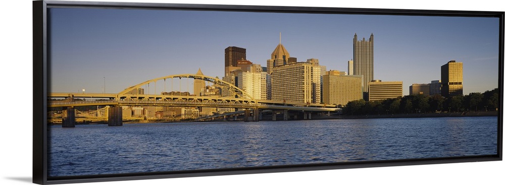 <p>Giant, panoramic photograph of the Pittsburgh skyline, and the Fort Pitt Bridge in the foreground, over the Monongahela River .</p>