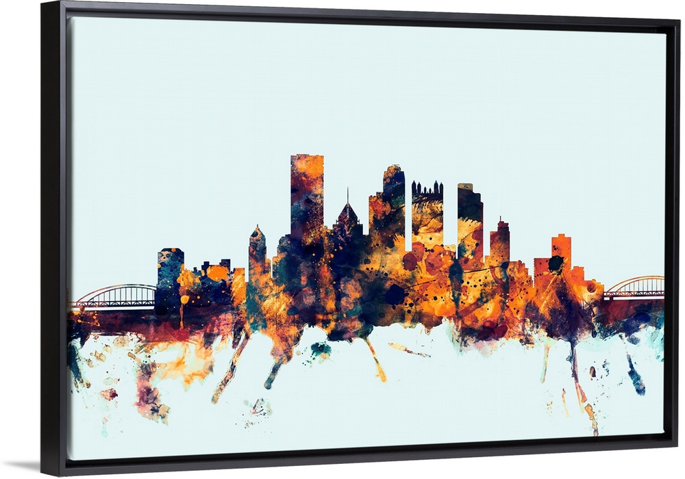 <p>Dark watercolor silhouette of the Pittsburgh city skyline against a light blue background.</p>