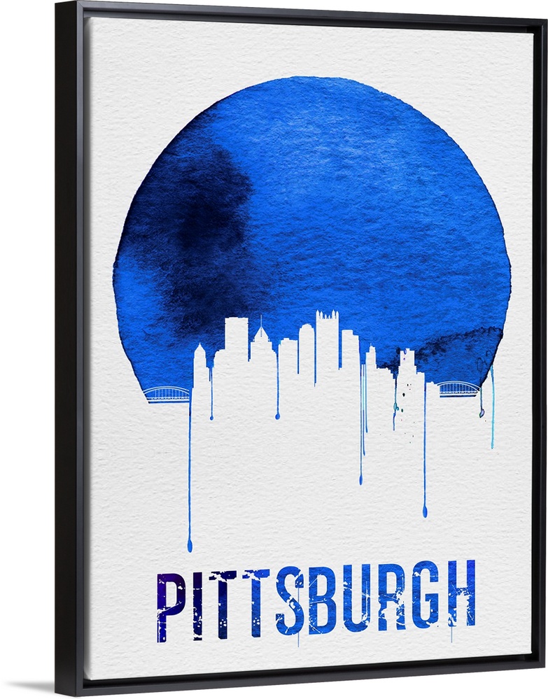 <p>Contemporary watercolor artwork of the Pittsburgh city skyline, in silhouette.</p>