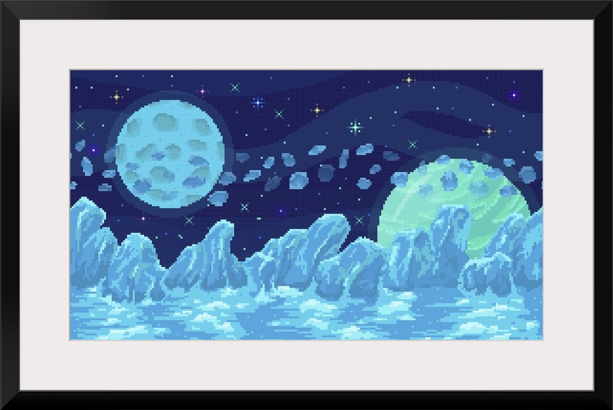 <p>Space pixel art. Ice landscape with mountains, planet and stars. 8 bit galaxy area with few planets.</p>