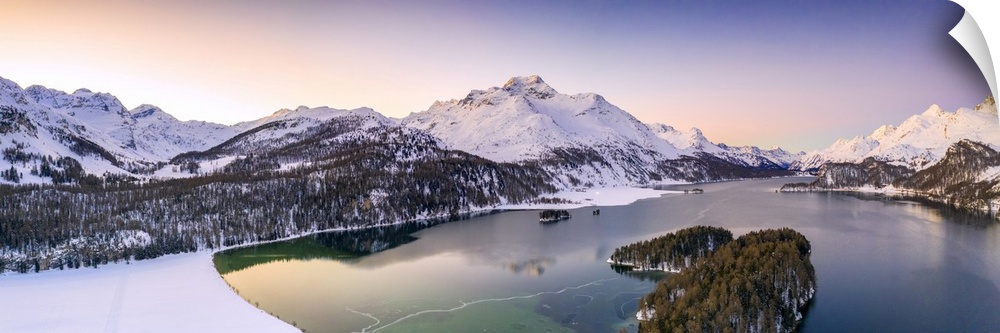 <p>Aerial panoramic of Piz Da La Margna and Lake Sils during a winter sunrise, Engadine, canton of Graubunden, Switzerland, Europe</p>