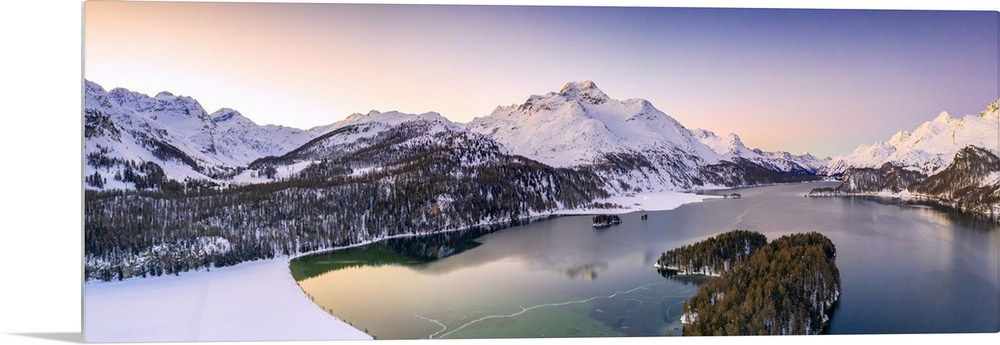 <p>Aerial panoramic of Piz Da La Margna and Lake Sils during a winter sunrise, Engadine, canton of Graubunden, Switzerland, Europe</p>
