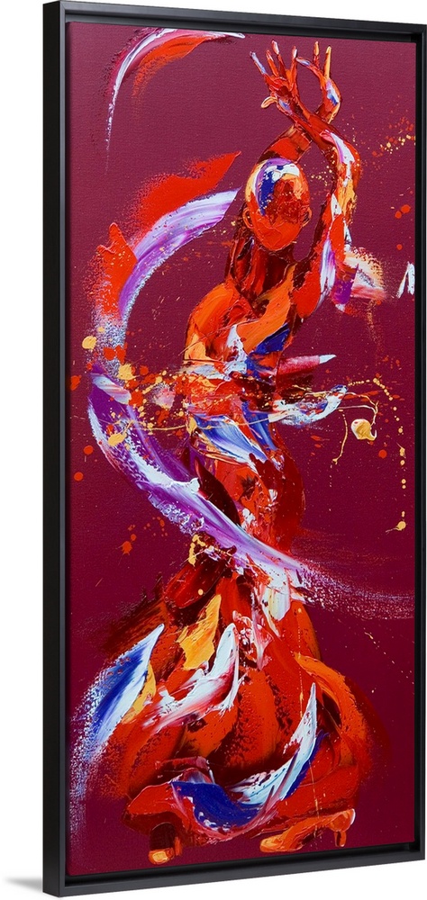 <p>Contemporary painting using deep warm colors to create a woman dancing against a deep red background.</p>