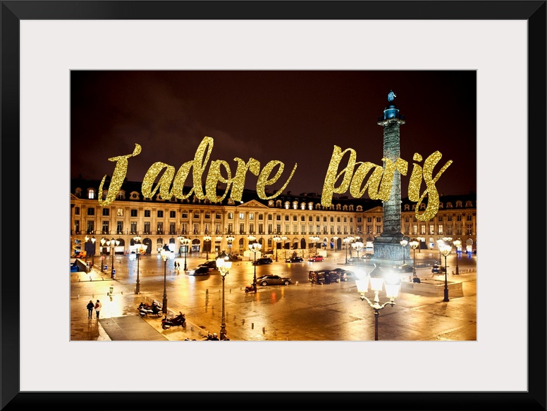<p>Nighttime photograph of Place Vendome with the phrase "J'adore Paris" written in gold glitter. From the Paris Fashion Series.</p>
