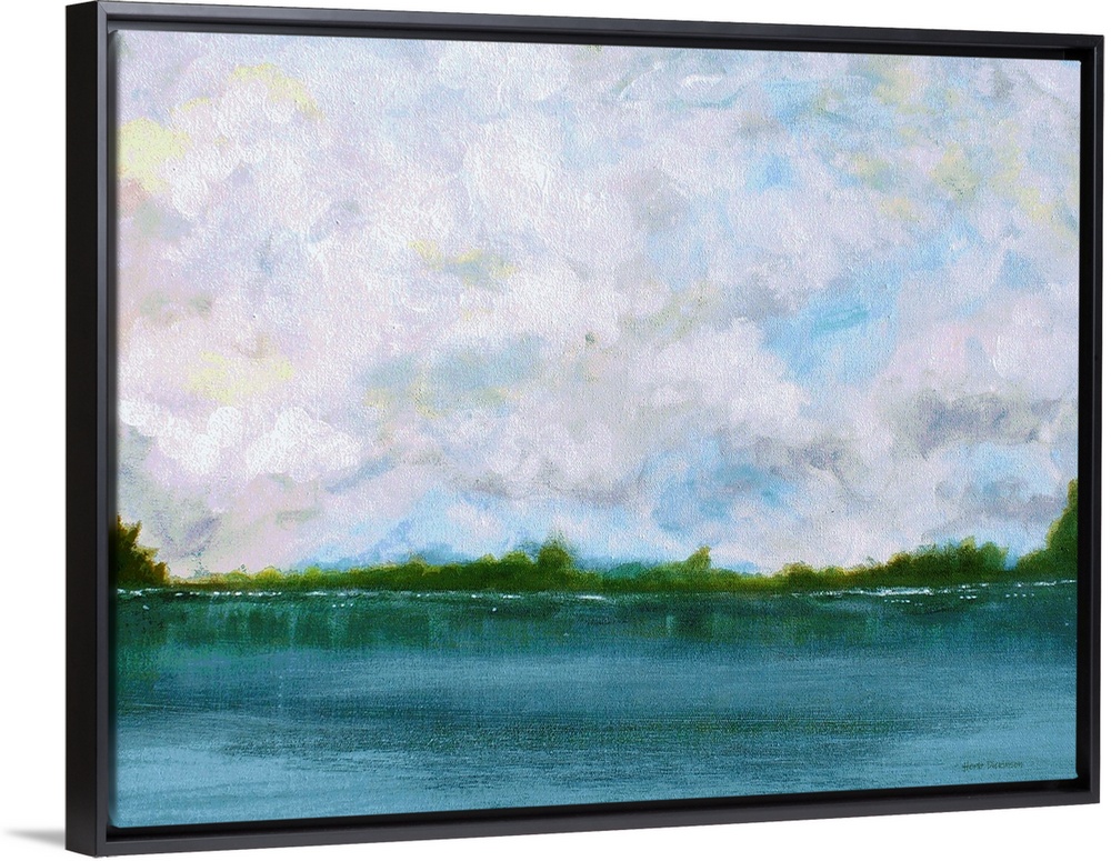 <p>Contemporary landscape painting of a calm and peaceful lake with green trees in the horizon and fluffy clouds above.</p>