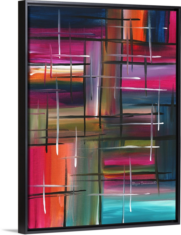 <p>A fun and playful abstract featuring a variety of both bright and deep hues with brushstrokes in different directions and black and white vertical and horizontal lines layered on top.</p>