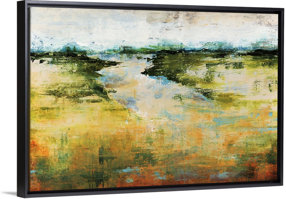 <p>A flat landscape and horizon in this abstract painting created with vague and dripping shapes.</p>