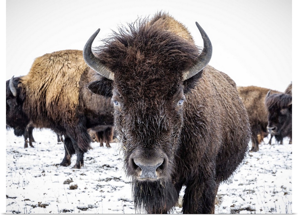 <p>Close-up of Plains Bison (Bison bison) looking at the camera; Manitoba, Canada</p>