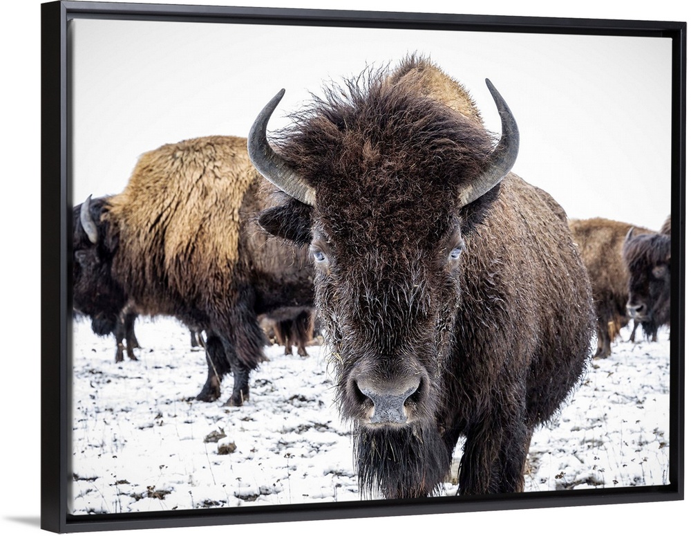 <p>Close-up of Plains Bison (Bison bison) looking at the camera; Manitoba, Canada</p>