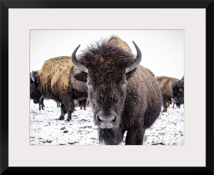 <p>Close-up of Plains Bison (Bison bison) looking at the camera; Manitoba, Canada</p>