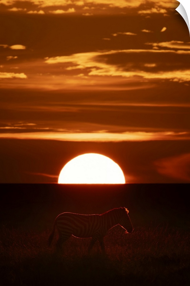 <p>Plains zebra (Equus quagga) crossing the savannah silhouetted at sunset in Maasai Mara National Reserve; Narok, Masai Mara, Kenya.</p>