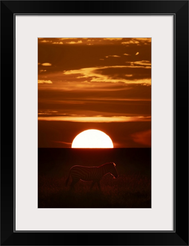 <p>Plains zebra (Equus quagga) crossing the savannah silhouetted at sunset in Maasai Mara National Reserve; Narok, Masai Mara, Kenya.</p>