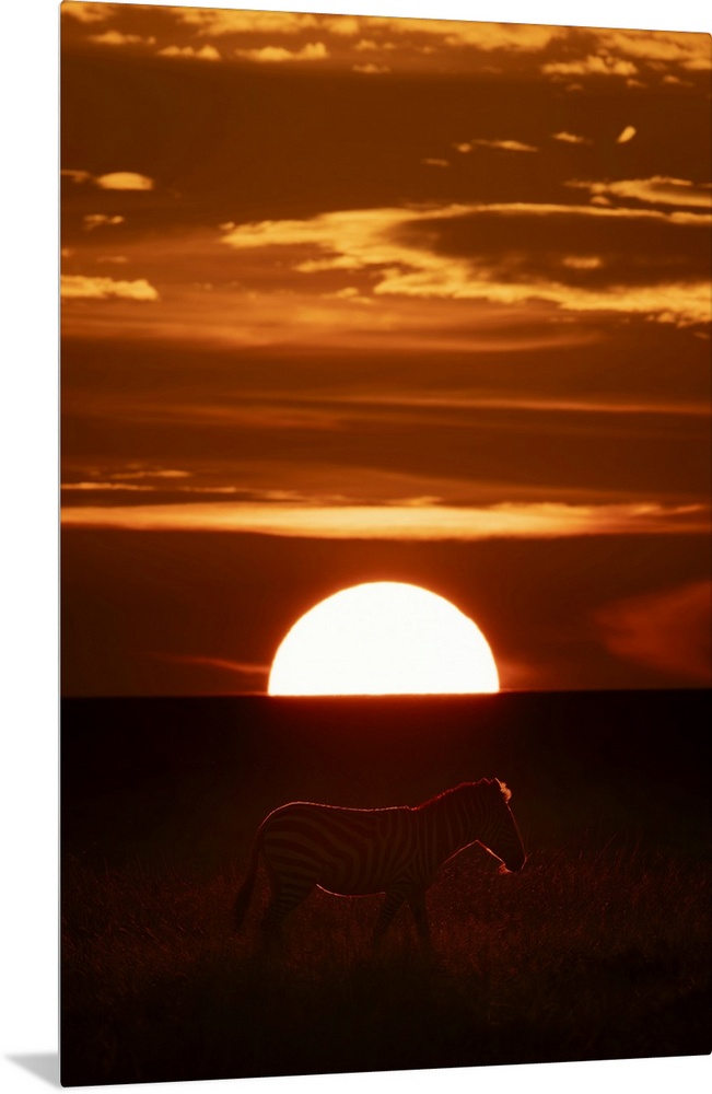 <p>Plains zebra (Equus quagga) crossing the savannah silhouetted at sunset in Maasai Mara National Reserve; Narok, Masai Mara, Kenya.</p>