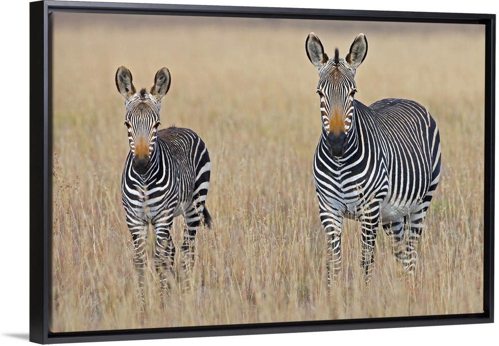 <p>Plains zebra (Equus quagga) with foal in grasslands, Mountain Zebra National Park, Eastern Cape Province, South Africa</p>
