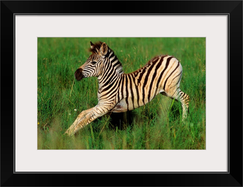 <p>Plains Zebra (Equus quagga) foal stretching, Midmar Game Reserve, Midlands, KwaZulu-Natal, South Africa.</p>