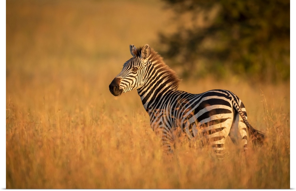 <p>Plains zebra (Equus quagga) stands in grass watching camera, Serengeti National Park; Tanzania</p>