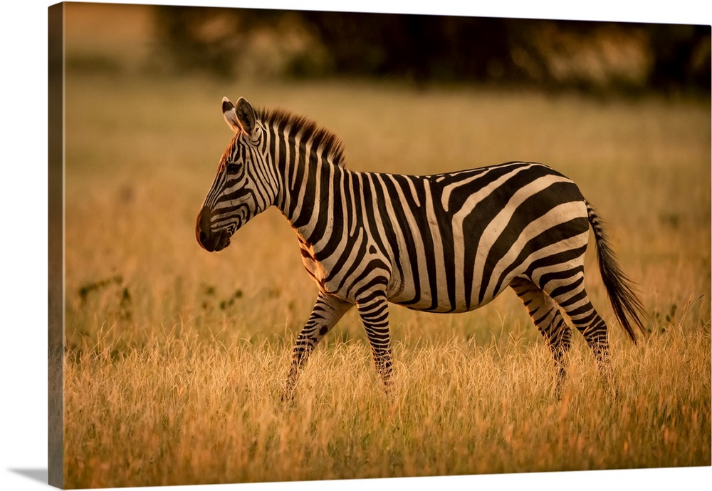 <p>Plains zebra (Equus burchellii) walks rim lit by sunset, Grumeti Serengeti Tented Camp, Serengeti National Park; Tanzania</p>