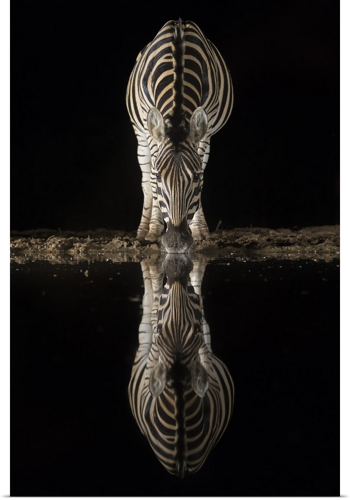 <p>Plains zebra (Equus quagga) drinking at night, Zimanga private game reserve, KwaZulu-Natal, South Africa, Africa</p>