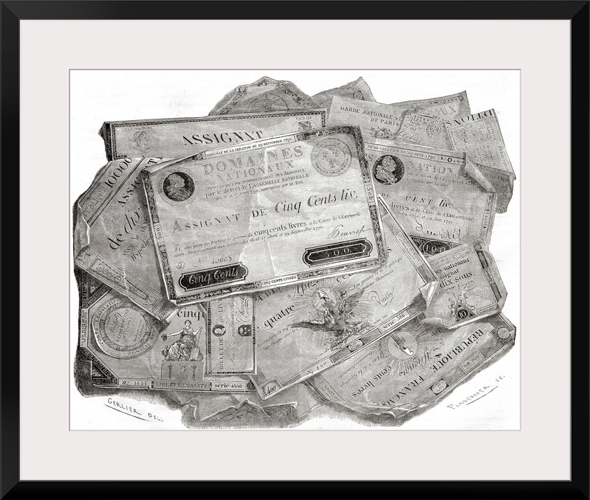 <p>Planche D'assignats. Interest Bearing Bonds. Any Of The Notes Issued As Paper Currency In France (1789-1796) By The Revolutionary Government And Secured By Confiscated Lands. Engraved By Pannemaker After Gerlier. From "Histoire De La Revolution Francaise" By Louis Blanc.</p>