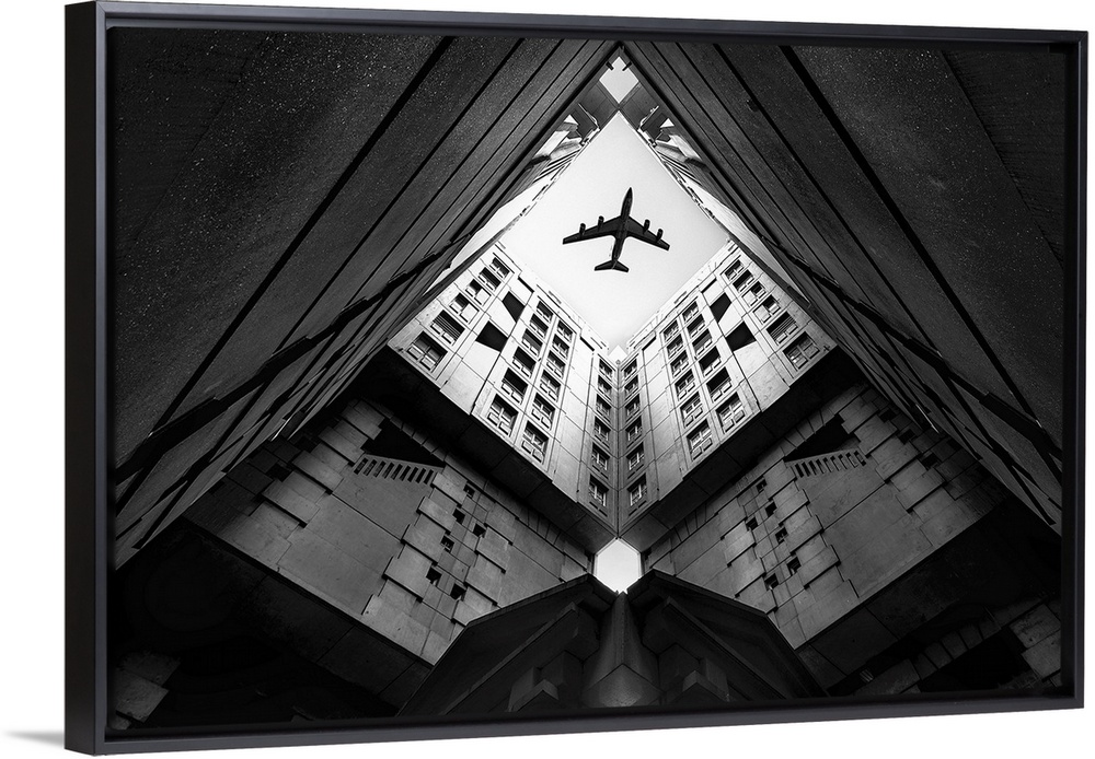 <p>Looking up through the courtyard of a building to see an airplane flying above.</p>