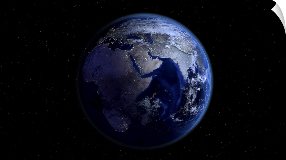 <p>Planet Earth showing Africa, Europe and Asia, half night and half day with city lights</p>