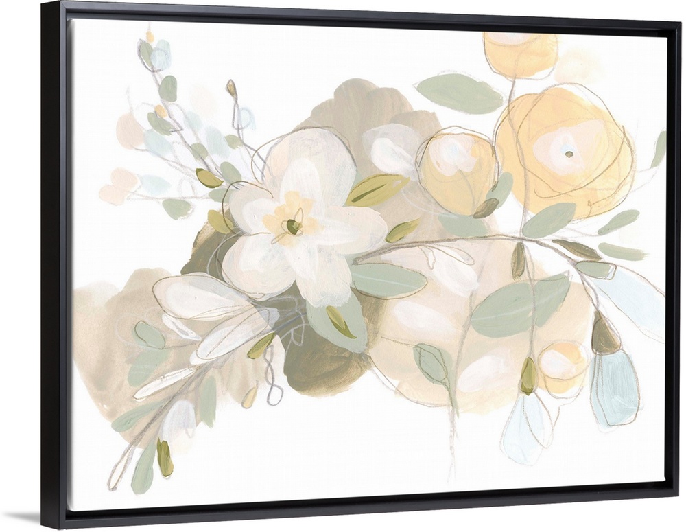 <p>Delicate gestural flowers in soft hues of yellow, beige and green pervade across a white background in this decorative artwork.</p>