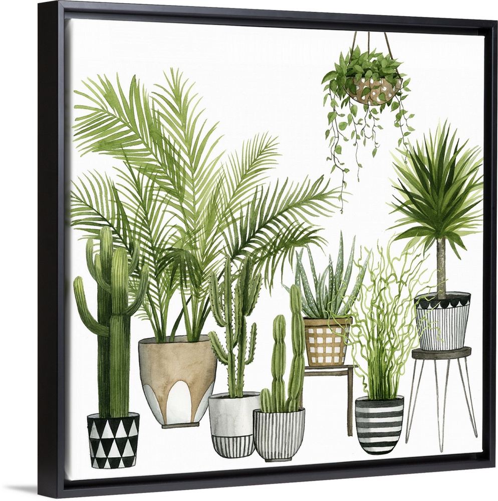 <p>Illustration of a large collection of tropical plants and succulents, including palms and cacti.</p>