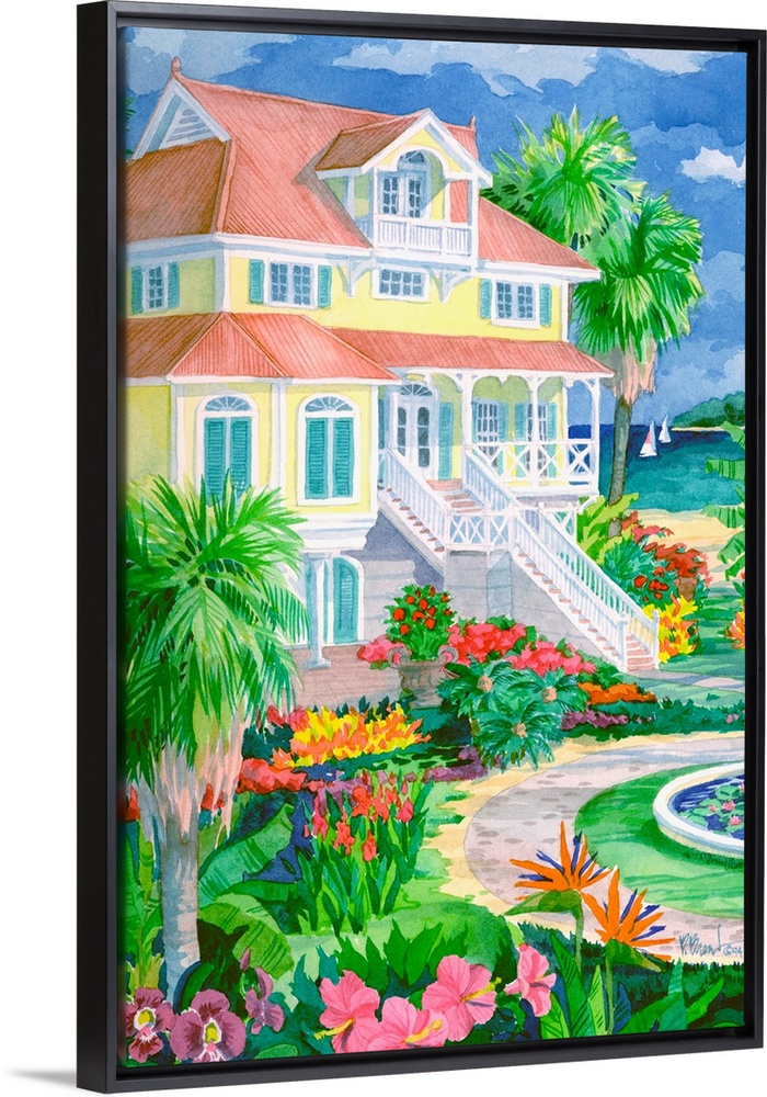 <p>Contemporary painting of a plantation-style home near a tropical beach.</p>
