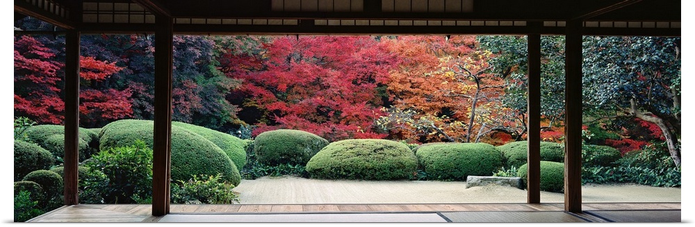 <p>This panoramic photograph is taken from inside a temple and looking out into a forest filled with trees and plants.</p>