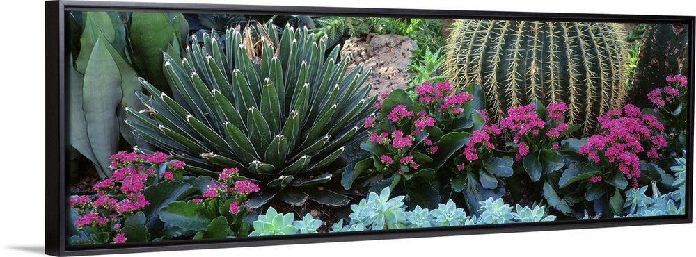 <p>Panoramic photograph taken of different types of cactus plants and flowers.</p>