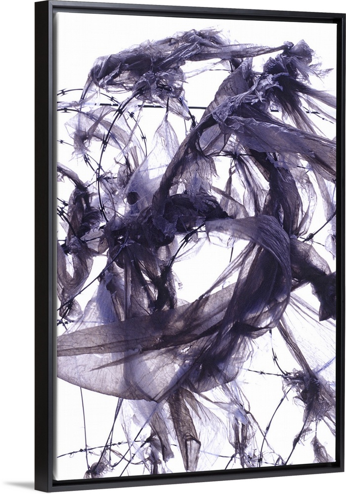<p>This fine art photograph is a close up photograph of ragged and decaying plastic bags snagged in a barbwire fence. The dark shapes of the bags and wire contrasting with the sky creates a dramatic piece of artwork.</p>