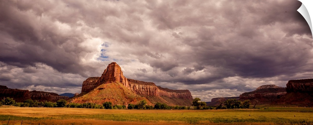 <p>Landscape photograph of large rock formations under a cloudy sky.</p>