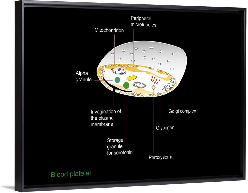 <p>Platelet. Artwork showing the internal structure of platelets, fragments of white blood cells that under normal circumstances are small and biconcave in form (as here). When activated by breaks in blood vessel walls, they extend long filaments that adhere to the vessel wall and each other, forming a clot. The microtubules around the fragment edge facilitate this change in shape. The alpha granule contains growth factors that aid clotting. Also seen are mitochondria and glycogen granules, which provide energy for the platelet, and Golgi apparatus, which modify and package proteins.</p>