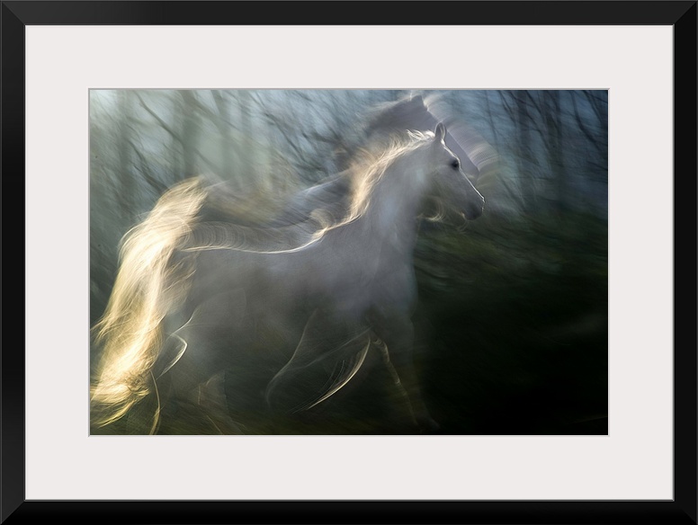 <p>Multiple exposure photograph of a white horse standing in a forest.</p>