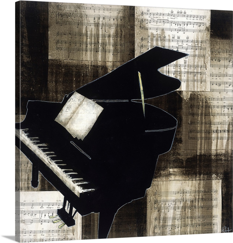 <p>Striking black grand piano silhouette against a vintage sheet music and sepia-toned abstract background. A moody, elegant piece celebrating music and art.</p>