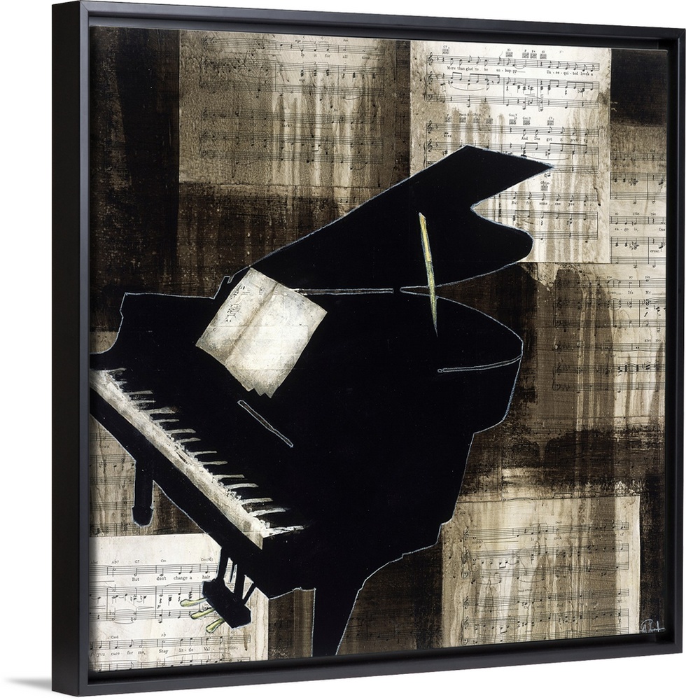 <p>Striking black grand piano silhouette against a vintage sheet music and sepia-toned abstract background. A moody, elegant piece celebrating music and art.</p>