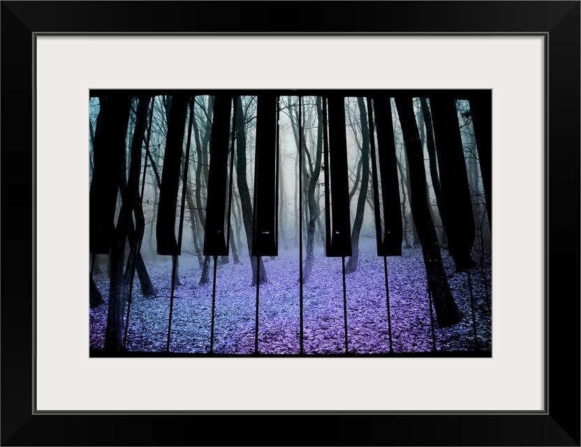 <p>A gloomy forest with twisted bare trees is pictured onto piano keys.</p>