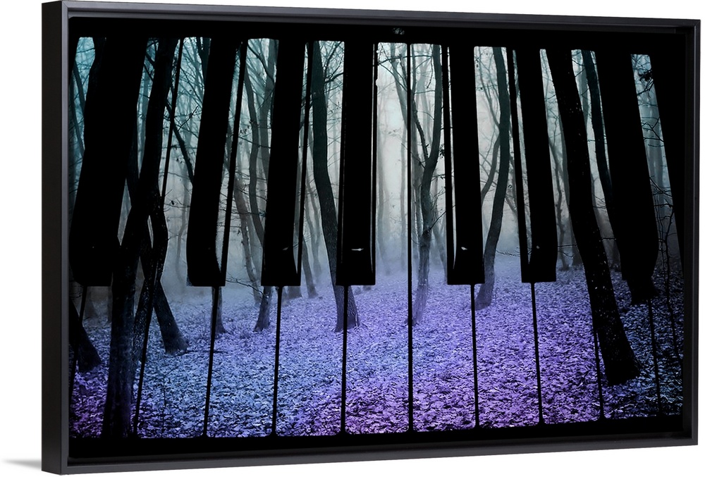 <p>A gloomy forest with twisted bare trees is pictured onto piano keys.</p>