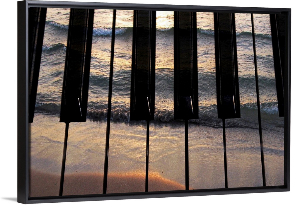 <p>Big photograph focuses on the keys of a piano that have another picture of a sea crashing into a sandy beach laid out within them.</p>