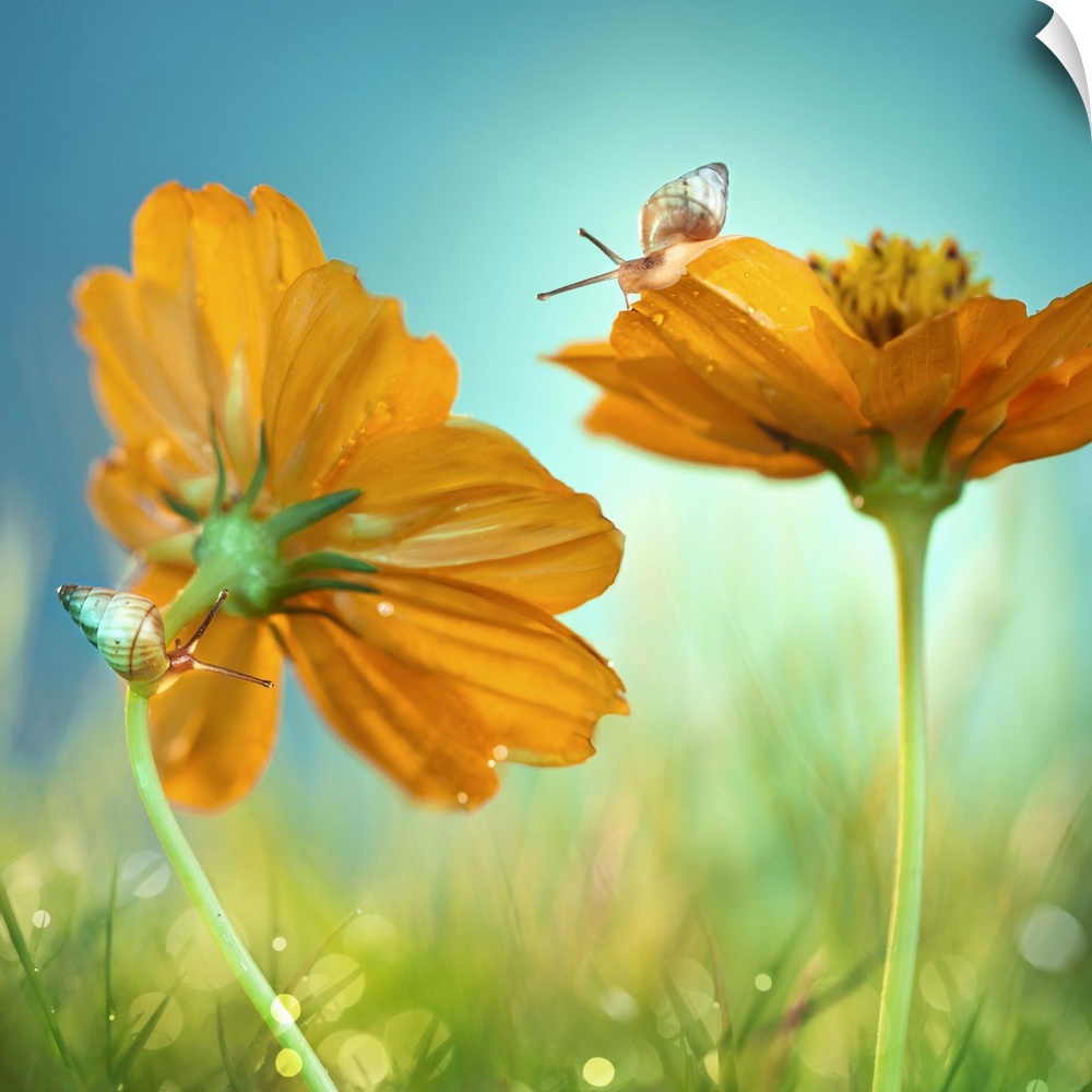 <p>Two snails crawling on two orange flowers in the grass.</p>