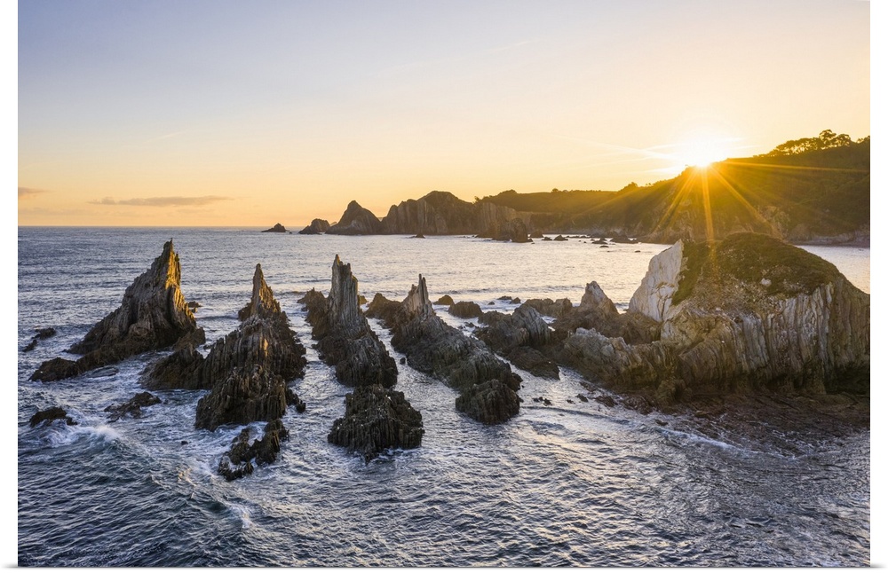 <p>Playa Gueirua, Santa Marina, Asturias, Spain. La Forcada (The Pitchfork) sea stacks at sunrise</p>