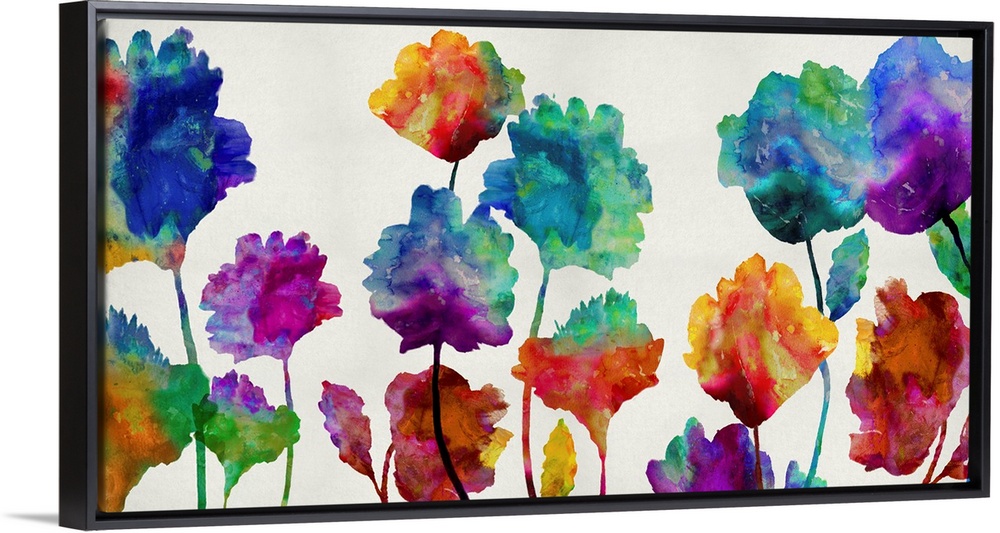 <p>Large art with silhouettes of flowers with multiple colors melding together with a watercolor look on a plain background.</p>