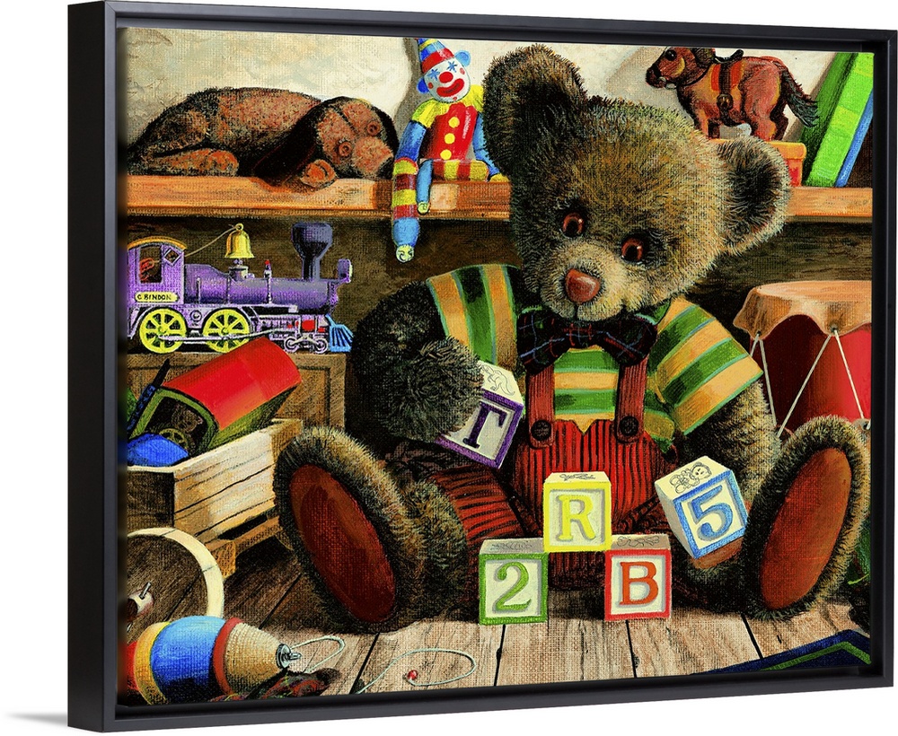 <p>A young teddy bear plays with his blocks in his room.</p>