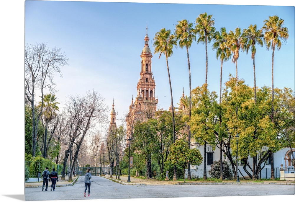 <p>Plaza de Espana from Maria Luisa Park, Seville, Spain with palm trees.</p>