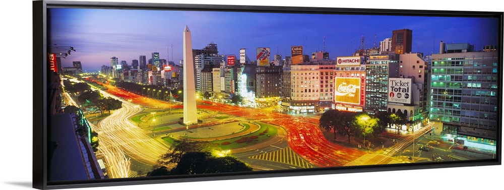 <p>Brightly colored panoramic image of slowly exposed light from a bunch of cars' headlights and brake lights going around a monument in the middle of a city.</p>